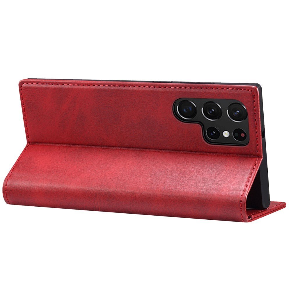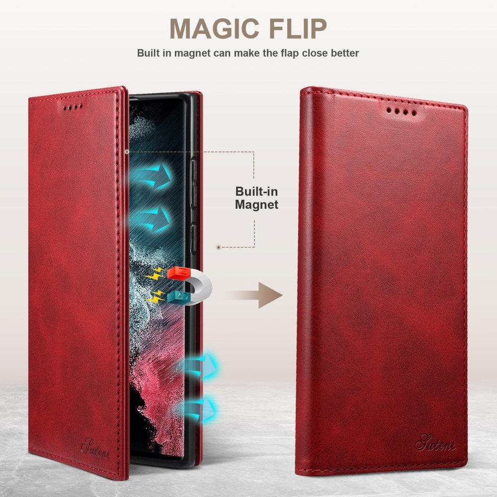 SUTENI for Samsung Galaxy S22 Ultra 5G Shockproof Auto-absorbed Magnetic Stand Wallet Leather Well-protected Phone Case Cover – Red